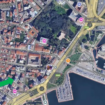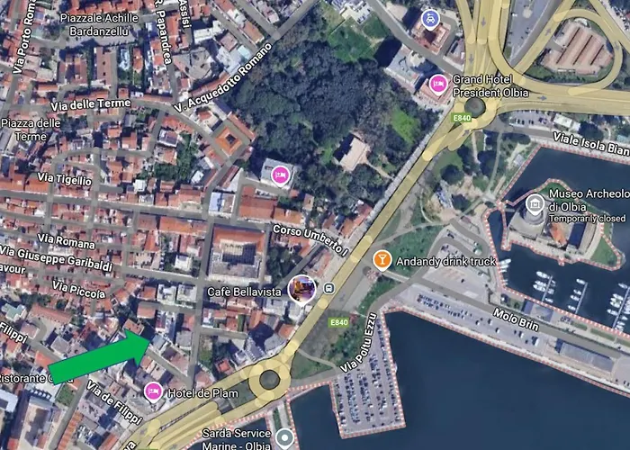 A 110 m^2-es apartman Olbia központjában található, és gyors hozzáférést biztosít a mindössze 13 percnyi sétára található Saint Simplicionhoz. A Fausto Noce Park 16 perc alatt elérhető gyalogosan. A Szent Pál-templom továbbá a közelben helyezkedik el az apartmantól.